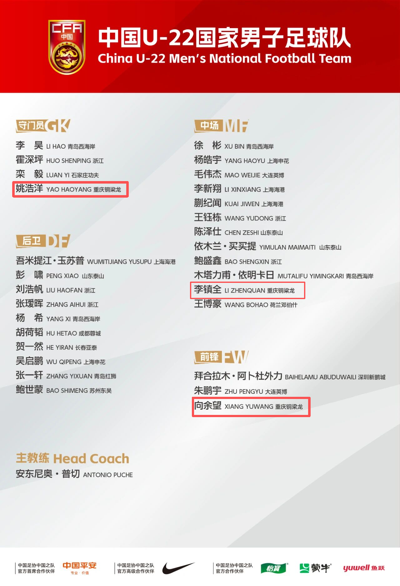 12月4日,中國足協公布備戰U23亞洲杯集訓名單,重慶銅梁龍隊的姚浩洋、李鎮全、向余望三名球員成功入選,將隨隊赴廣東省肇慶市參加集訓并赴